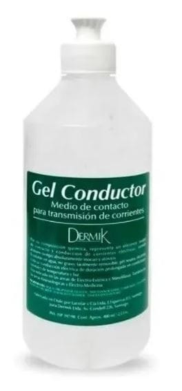 para transmisión de corriente Dermik 500ml. Gracias a su composición concentrada tiene excelentes características de conducción de corriente eléctrica, es atóxico e inocuo. Es soluble en agua, no graso, ph neutro, recomendado para la masofilaxia, electrofísicos, maquinarias kinesiologícas y electro medicina.